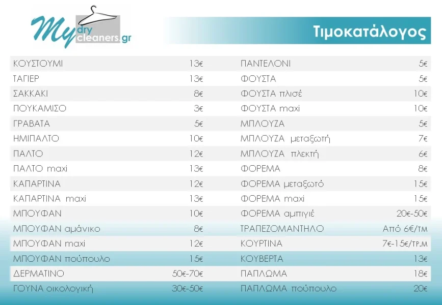 Καθαριστήριο ρούχων Τιμές. Οι τιμές μας είναι βασισμένες στο μέσο κόστος καθαρισμού κάθε είδους καθώς και τον χρόνο επεξεργασίας του. Είδη ενδυμασίας με πρόσθετα αξεσουάρ ή ευαίσθητα μέρη χρεώνονται διαφορετικά και πάντα σε συνεννόηση με το κατάστημα. Δύσκολοι λεκέδες ή περιπτώσεις που χρίζουν ειδικής αντιμετώπισης χρεώνονται ανάλογα και πάντα σε συνεννόηση με το κατάστημα.
